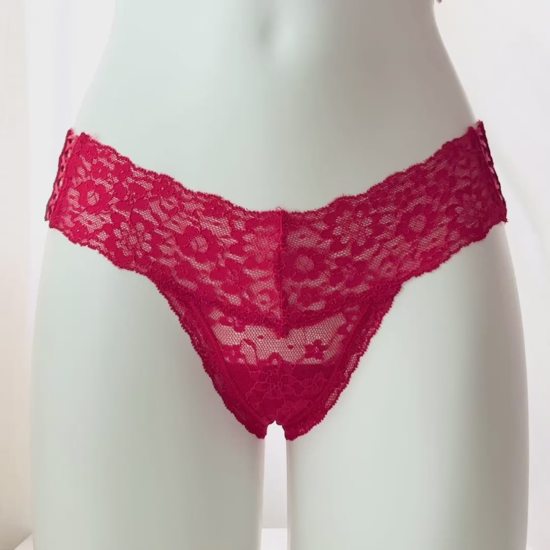 This low-rise thong panty features all-over stretch posey floral lace with delicate trim at the legs for a feminine finish. Flirty lace-up sides add a unique detail while lying flat for a smooth, no-show fit under clothing. With minimal back coverage, a breathable 100% cotton gusset, and fabric partially made from recycled materials, this thong offers both style and sustainability. Perfect for when you want a panty that’s equal parts romantic, lightweight, and comfortable.