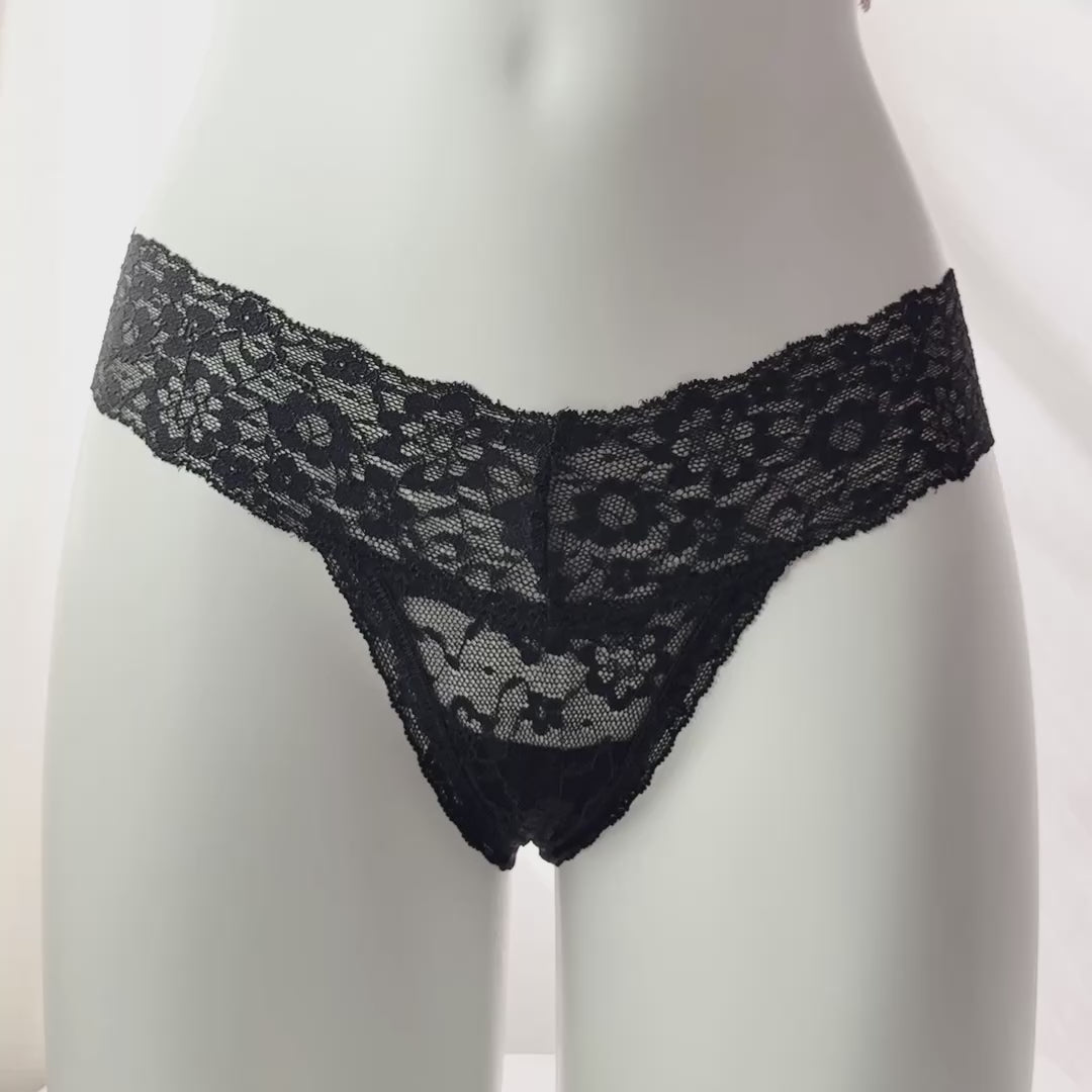 This panty features a thong style with minimal back coverage and a flattering low-rise fit. The all-over sheer stretch posey floral lace gives it a delicate, beautiful look that stays flat for a no show-through effect, making it perfect for any outfit. Plus, it's made partially from recycled materials, so it's a more sustainable choice. The gusset is made from 100% cotton, ensuring breathability and comfort where it's needed most.